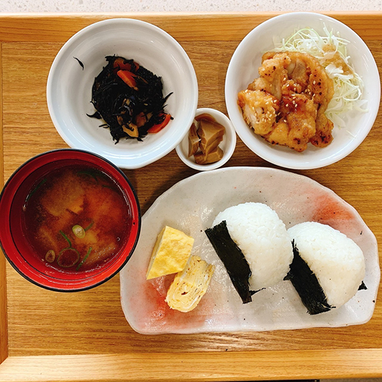 丹波産のこしひかりを使用した手作りのおにぎりと、豚汁、だし巻き、お漬物に週替わりの小鉢が2品ついた、毎週楽しみたい定食です。