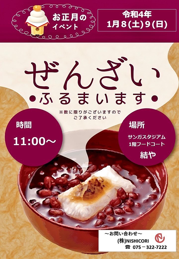 1月8日(土)、9日(日)限定で、ぜんざいのふるまいが行われます。11時~なくなり次第終了となりますので、お早めにご来場ください。